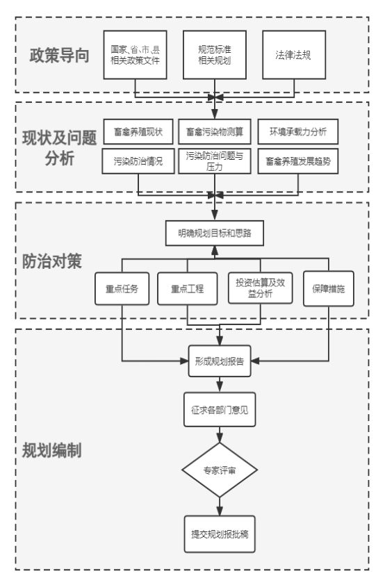 本規(guī)劃的技術(shù)路線主要由政策導(dǎo)向分析、現(xiàn)狀及問題分析、防治對策、規(guī)劃編制這四部分組成。通過對國家、省市畜禽養(yǎng)殖污染防治要求的分析,開展收集資料和現(xiàn)狀調(diào)查工作,分析畜禽養(yǎng)殖生產(chǎn)、污染防治、糞污資源化利用、環(huán)境承載力以及環(huán)境管理現(xiàn)狀,基于分析結(jié)果,明確重點建設(shè)項目和規(guī)劃實施的保障措施。在此基礎(chǔ)上,開展規(guī)劃的編制,形成規(guī)劃報告。